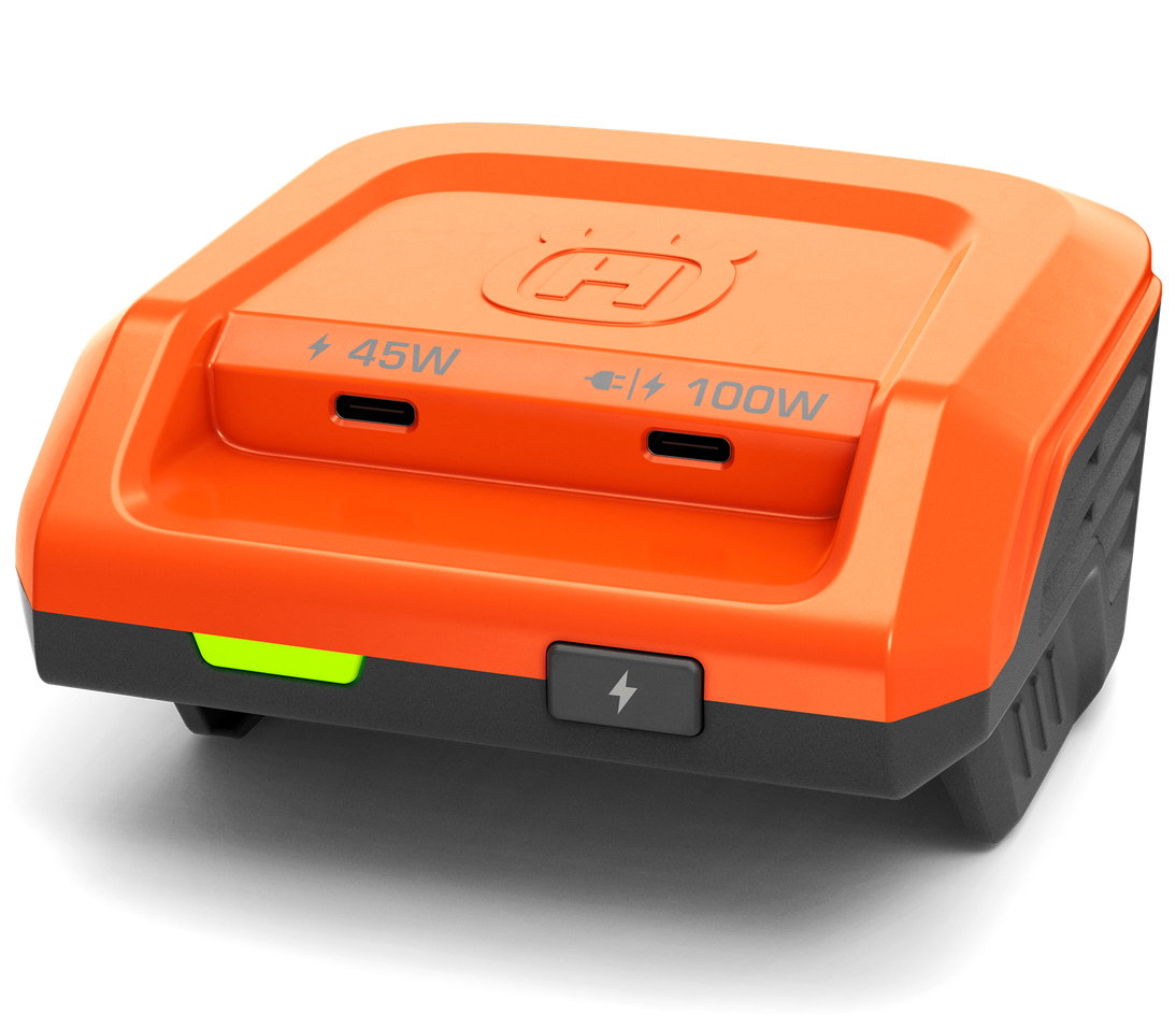 - Rugalmas töltés az USB-C porton keresztül: Husqvarna BLi-X 36V akkumulátorát USB-C kábelen keresztül töltheti, amely szabványos fali töltőhöz vagy más USB-kompatibilis áramforráshoz, például hordozható külső akkumulátorhoz (power bank) vagy mini napelemes töltőhöz csatlakoztatható.